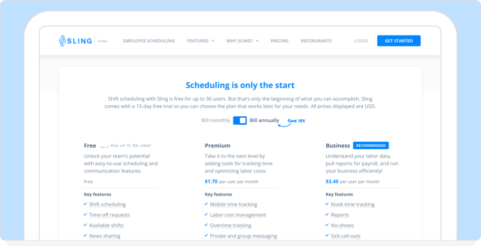 Sling centers the platform around scheduling, with time tracking, labor monitoring, and reporting appearing in paid tiers.