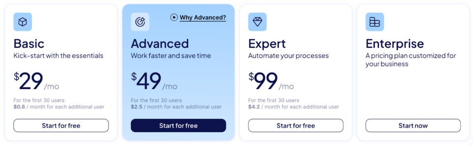 - Advanced: $49 per month for the first 30 users, then $2.50 per additional user