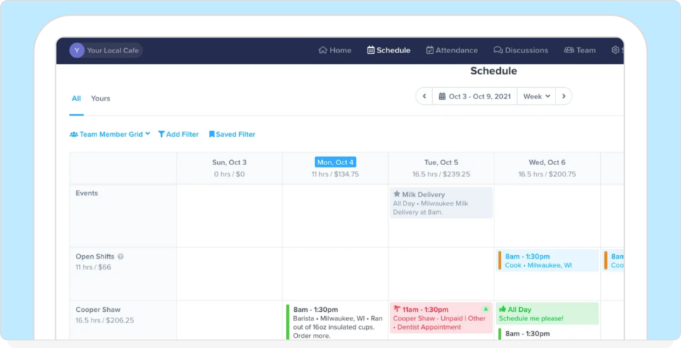 Your business operates from a single location, and you want to manage hiring, onboarding, and basic HR in the same app as your schedule. Homebase is a practical choice if your shifts are consistent and you prefer a broad, all-in-one tool for general team management with paid add-ons, rather than a specialized scheduling software.
