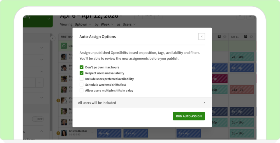 • Rule-based auto-scheduling: Rather than manually assigning shifts and checking for overlaps, the system uses pre-set rules, such as employee availability, roles, and labor limits, to build and verify the schedule automatically.