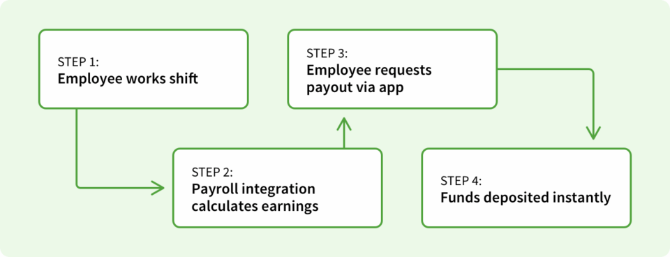 A standard scenario might be an outside provider that’s integrated to your payroll system using cloud-based technology, calculates how much each employee earns on each shift, and makes that amount available to them should they want to request it.