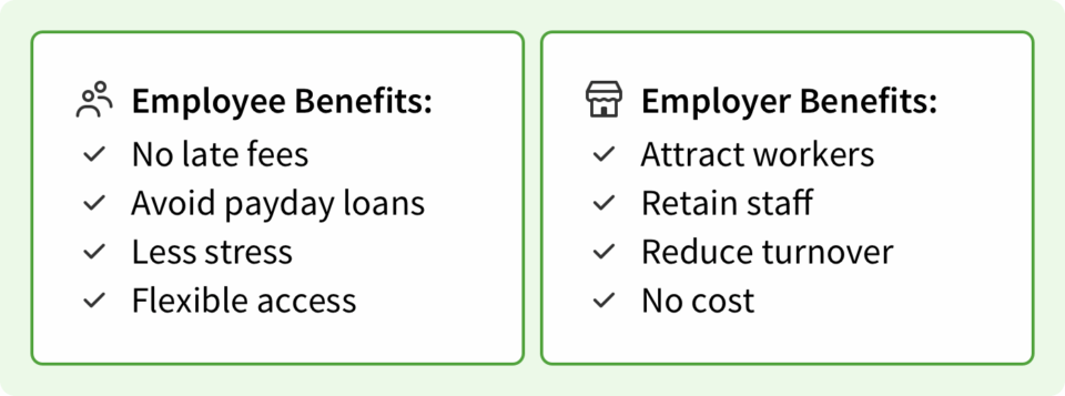 By giving your employees the ability to get to their money before payday means they don’t have to suffer from the financial burden of late fees, or turn to predatory payday loans or credit card debt to cover their needs. Emergencies are less stressful because they can access the money they’ve already earned whenever they need it.