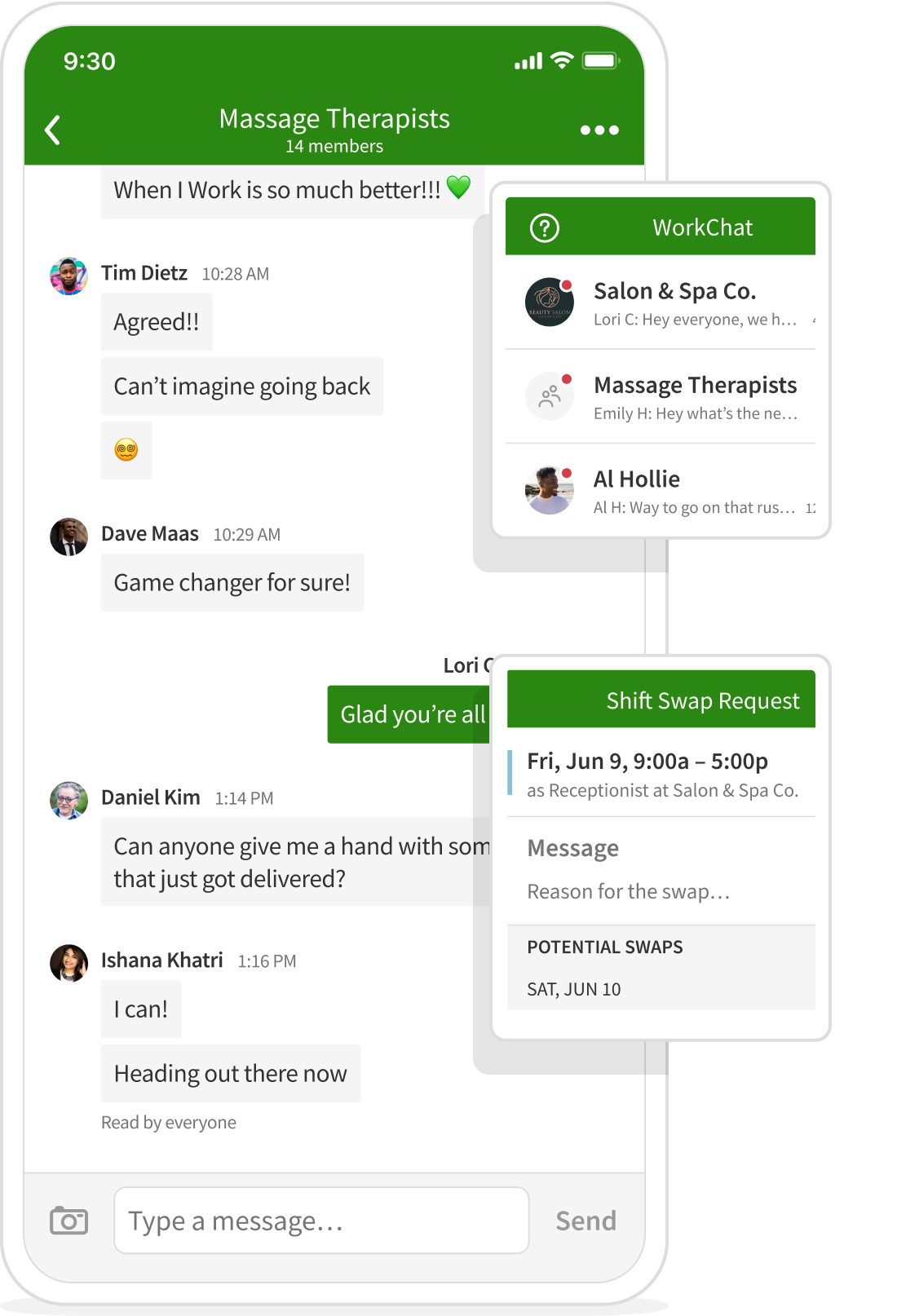 Ditch the scattered texts. When I Work is the spa employees’ management app that centralizes communication on one secure platform. Message spa therapists one-on-one about client needs, coordinate group chats for bridal party service providers, or send blast announcements to your entire staff instantly.